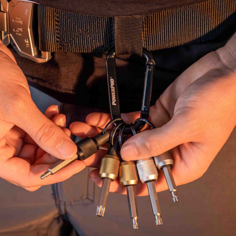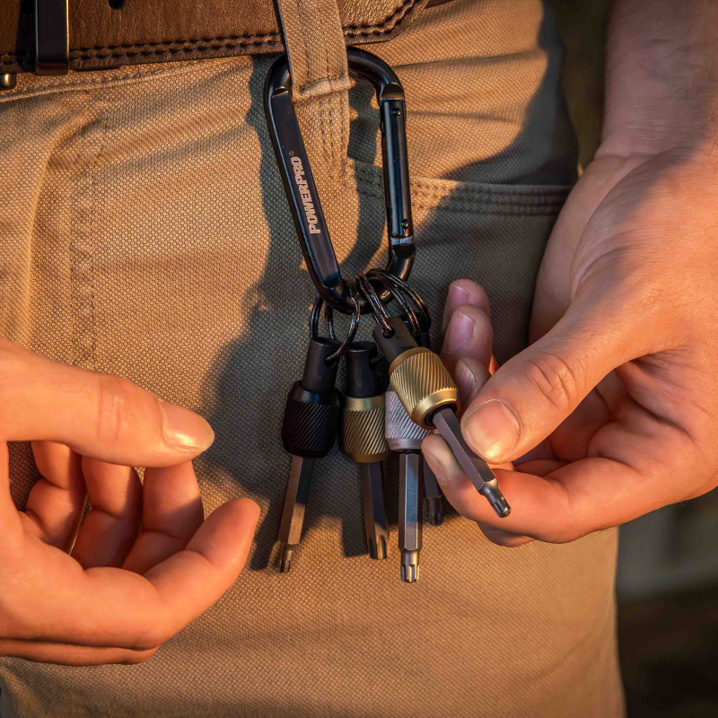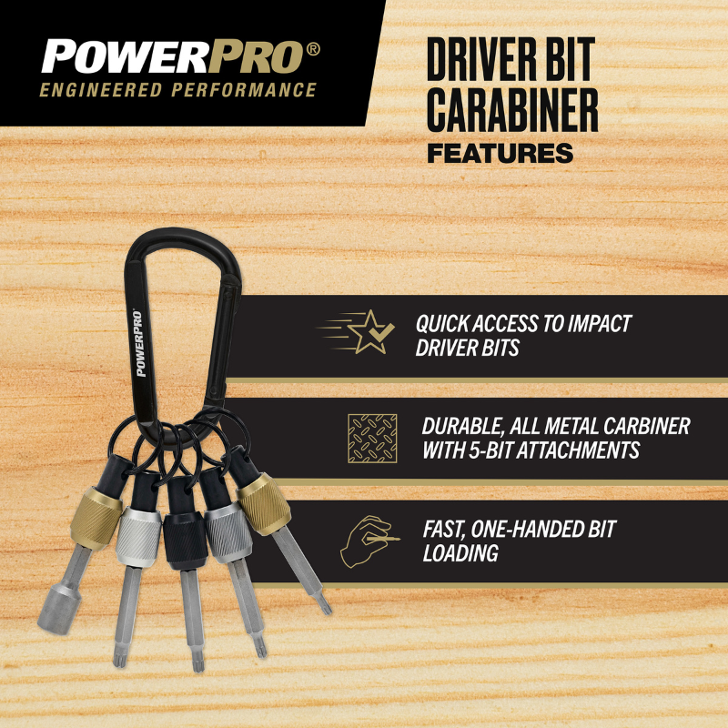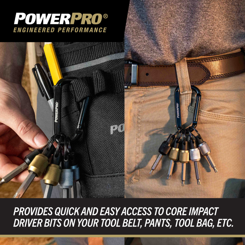A must-have on any jobsite, the Power Pro Driver Bit Carabiner is the perfect addition to your tool belt or tool bag. Specifically designed for quick and easy access to your core impact driver bits, the 5-bit attachment collets provide fast, one-handed bit loading with pull-to-release. Stop losing your impact driver bits and work lighter and more efficiently with the Power Pro Driver Bit Carabiner.