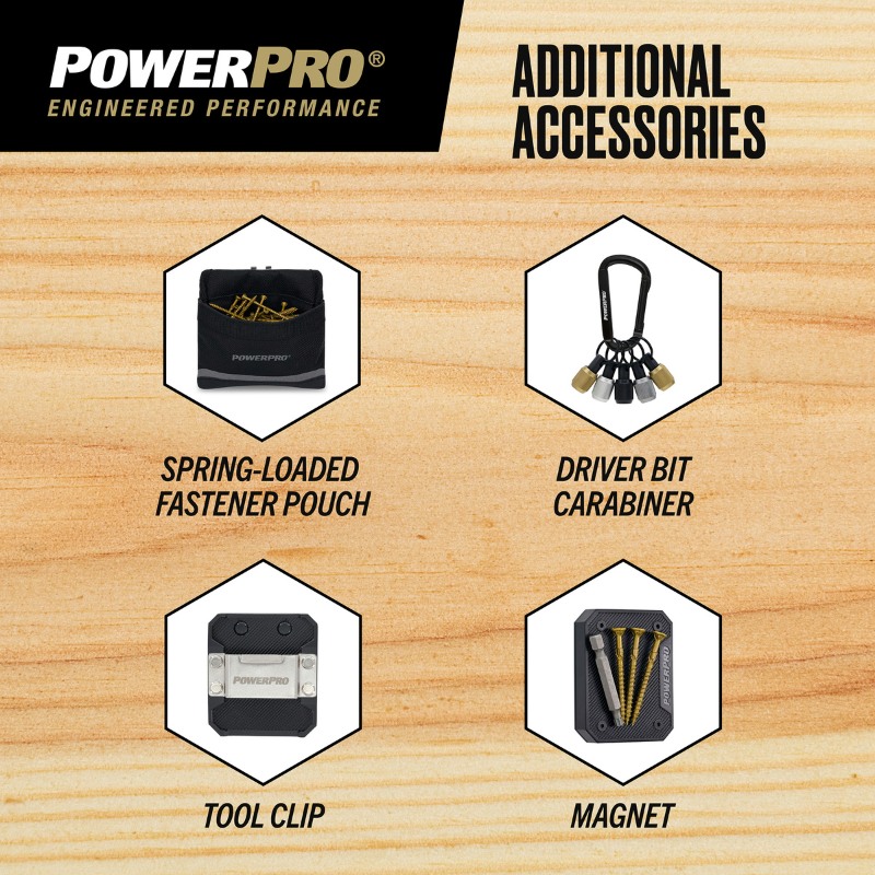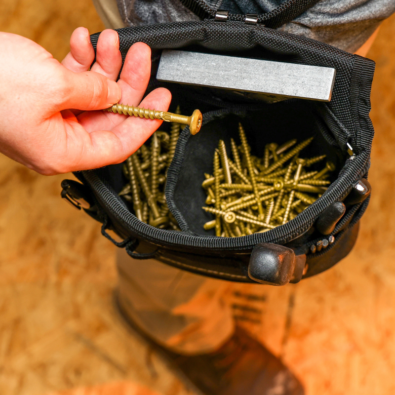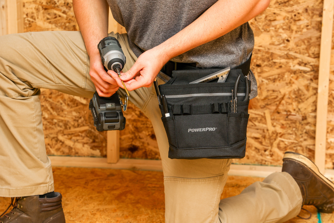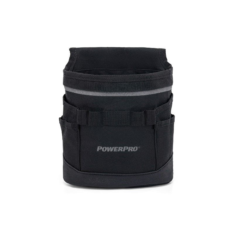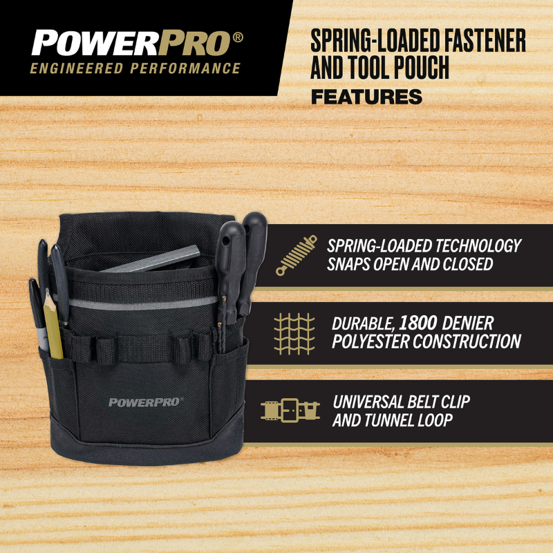 Incredibly handy for projects of any size, the Power Pro Spring-Loaded Fastener and Tool Pouch snaps shut to secure fasteners inside. This convenient pouch features an internal divider for fastener storage and multiple pockets for small tools. Constructed with water-resistant 1800 denier polyester, it's also reinforced at wear points for long-term durability. The universal belt clip easily attaches to belts and pants, or it can be threaded on your tool belt through the tunnel loop.