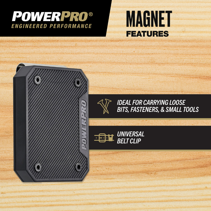 An essential on any jobsite, the Power Pro® Magnet is perfect for carrying loose fasteners, driver and drill bits, and even small tools. Its compact and lightweight design makes for quick, one-handed grabs, so you no longer need to carry around extra fasteners in your mouth or spare hand. The universal belt clip easily attaches to belts, pants, and more.