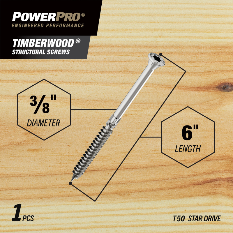 TimberWood Structural Screws are pro-grade structural fasteners engineered for wood-to-wood connections and timber frame construction. They require no pre-drilling and feature a countersinking flat head design for a clean finish. TimberWood Structural Screws are ideal for a variety of projects both indoors and outdoors. The proprietary coating prevents corrosion and is compliant with ACQ and other forms of treated lumber.